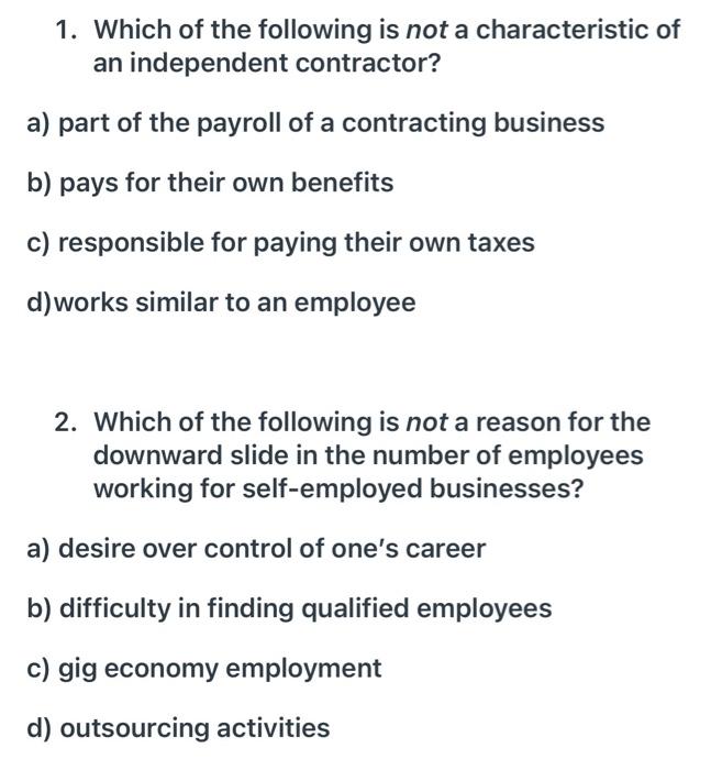 Many businesses prefer independent contractors versus workers for this reason. A worker may prefer to be treated as an independent contractor rather than an employee for which of the following reasons. They work mostly from home What is the chief justification for creating a special regime for employment contracts different from that governing.